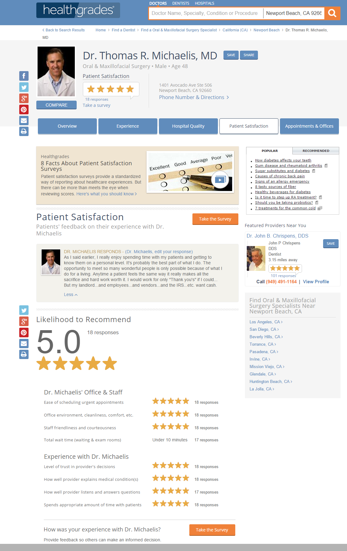Patients’ feedback on their experience with Dr. Michaelis on HealthGrades Website